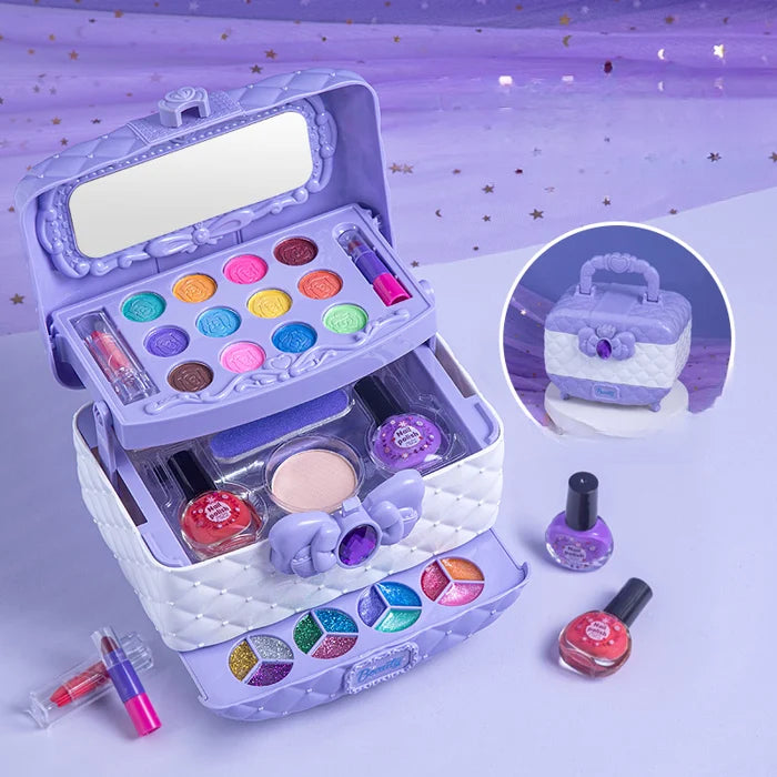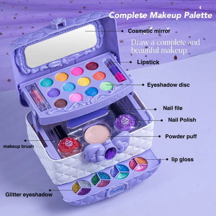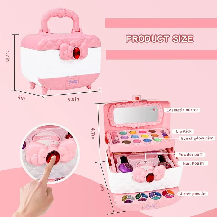 Ein ungiftiges Set ist eine fantastische Gelegenheit für Ihre kleine Fashionista, die Welt des Make-ups zu erkunden, ohne echte Produkte zu verwenden. Leicht mit Wasser abwaschbar, ungiftig und unschädlich. Erfüllt die Normen für internationales Kinderspielzeug (CPSIA, CPC, ASTM-Zertifikate)
