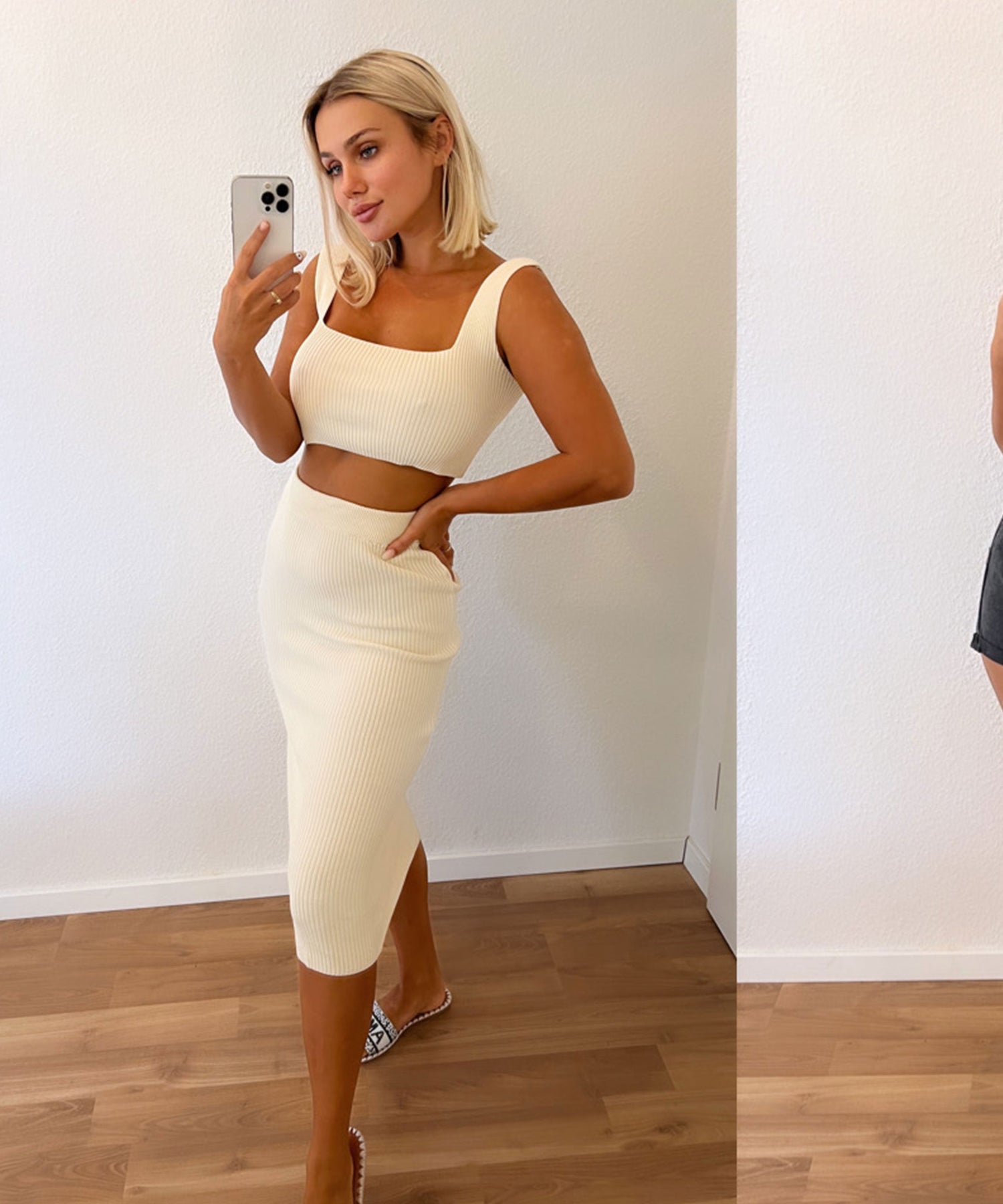 • Einheitsgröße passt XS-L. Model eins ist 1.69m. Model zwei ist 1.65m.