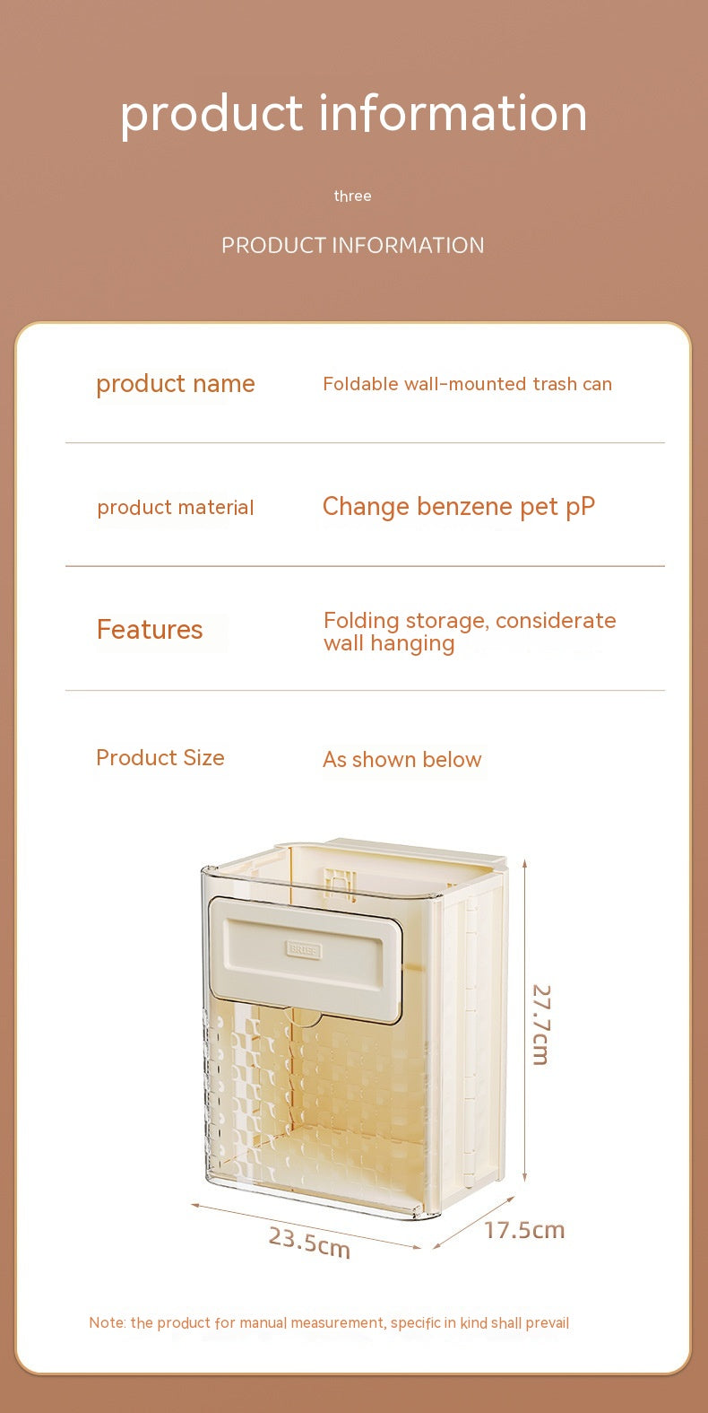 Mit seinem ausgeklügelten Design bringt FoldiBin™ einen Hauch von Raffinesse und eine Menge Praktikabilität in Ihr Zuhause. Egal, ob Sie ihn mit der stabilen Halterung auf den Boden stellen oder an einem Schrank aufhängen, dieser Mülleimer passt sich an Ihren Lebensstil und Ihre Einrichtung an. Er eignet sich perfekt für Küchen, Schlafsäle, Wohnzimmer, Schlafzimmer, Autos und Büros und ist damit die ultimative, vielseitige Lösung für ein stilvolles und müheloses Abfallmanagement.
