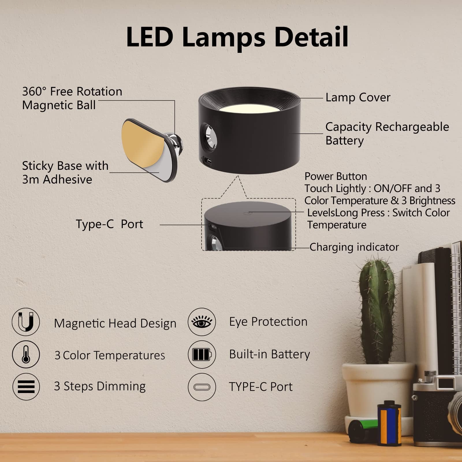 Ersetze deine umständlichen kabelgebundenen Lampen und Wandleuchten durch unsere kabellosen, magnetischen Leuchten. Die LED-Leuchten werden mit einer magnetischen Halterung und einem starken Kleber angeboten. Man braucht kein Werkzeug, keine Schrauben oder Muttern, und die Wand wird nicht beschädigt. Du kannst sie an jeder flachen und glatten Oberfläche oder Wand anbringen, um schattige Ecken zu erhellen oder die Inneneinrichtung zu verschönern.