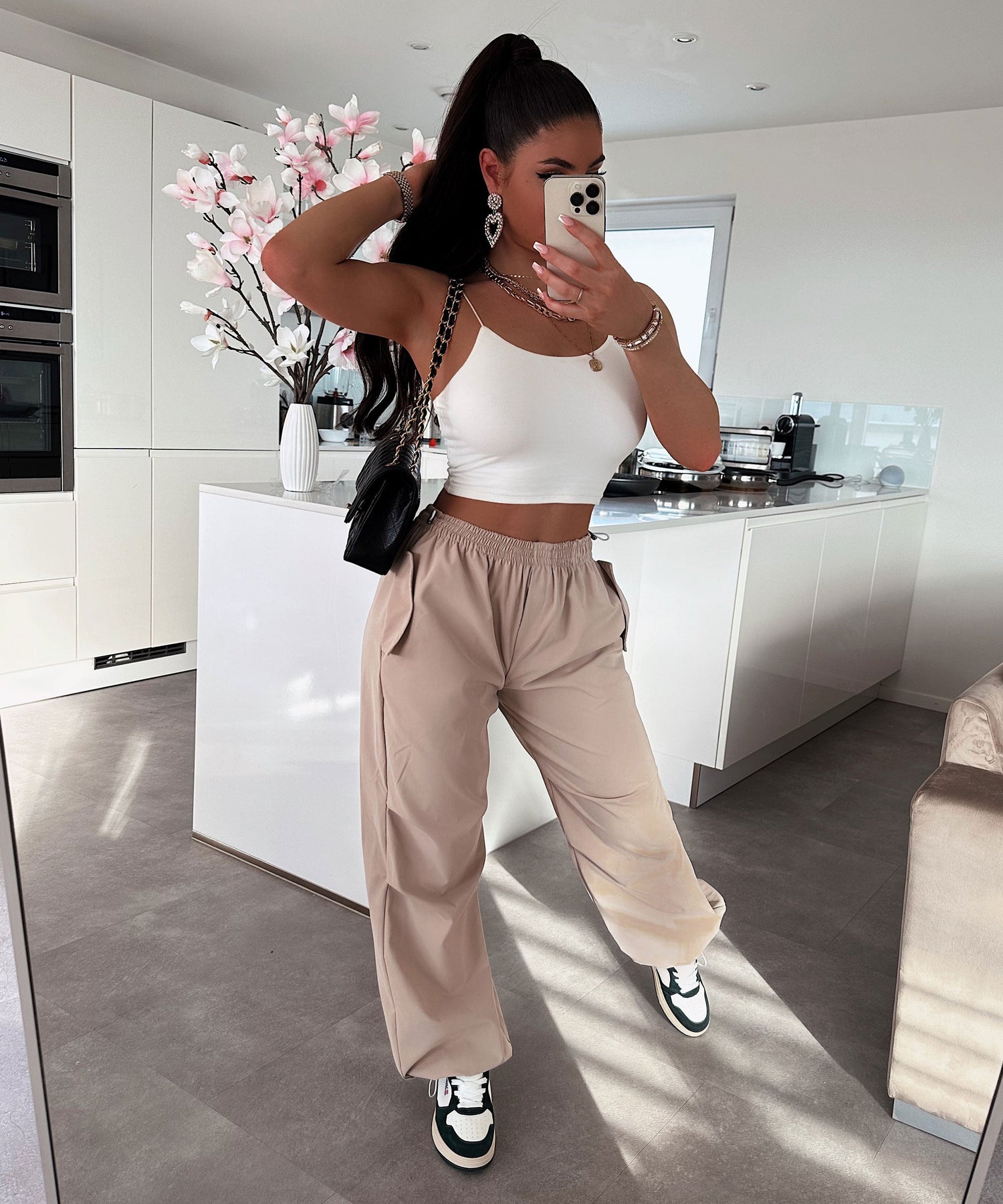 • Super bequeme Parachute Hose mit einem Gummizug am Knöchel, um sie eng oder locker zu tragen. Durch den dehnbaren Bund passt die Einheitsgröße den Größen XS-L. Unser Model ist 1,65m groß.