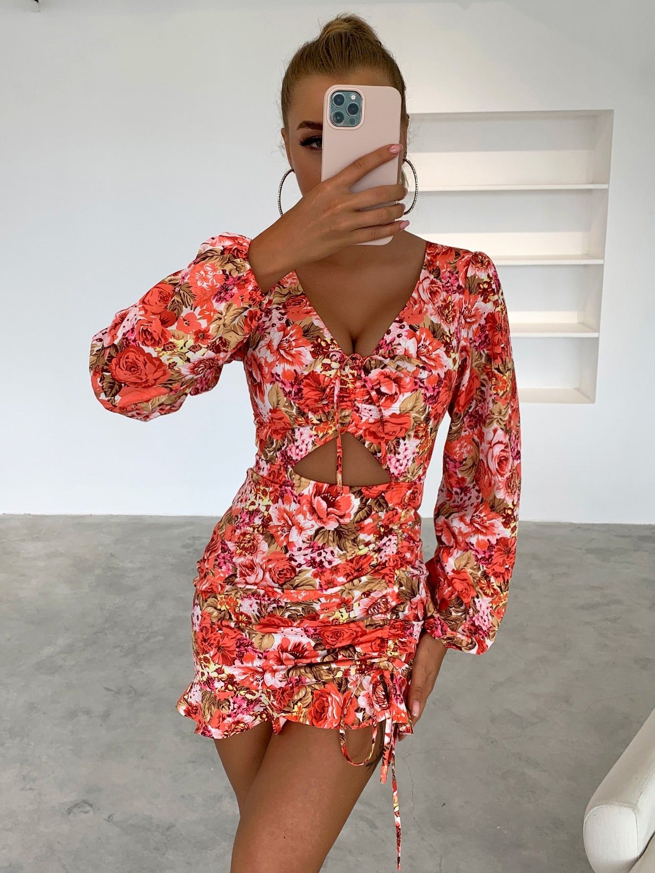 Figurbetontes Kleid mit Blume Muster, Knoten vorn, Ausschnitt, Rüschen