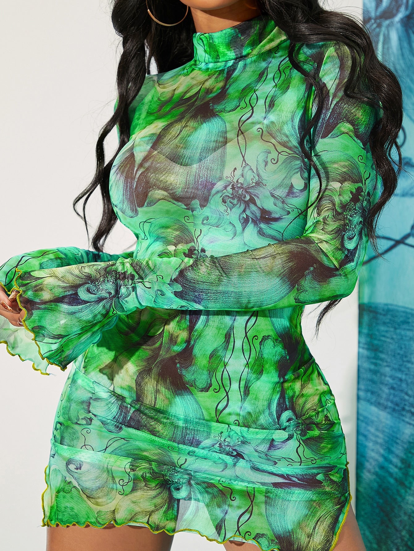 Kleid mit Blume Muster, Stehkragen, Mesh