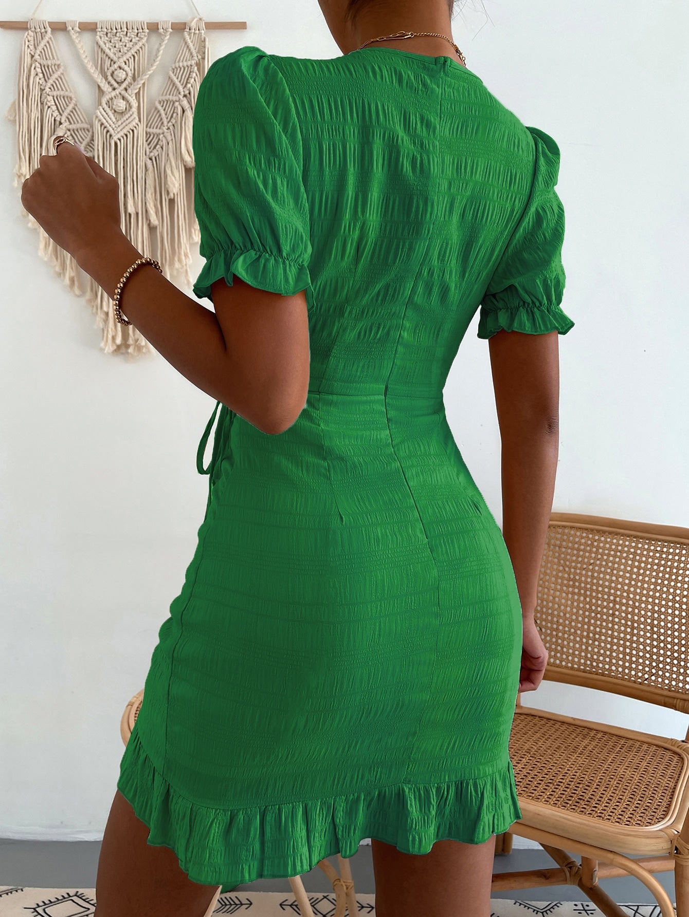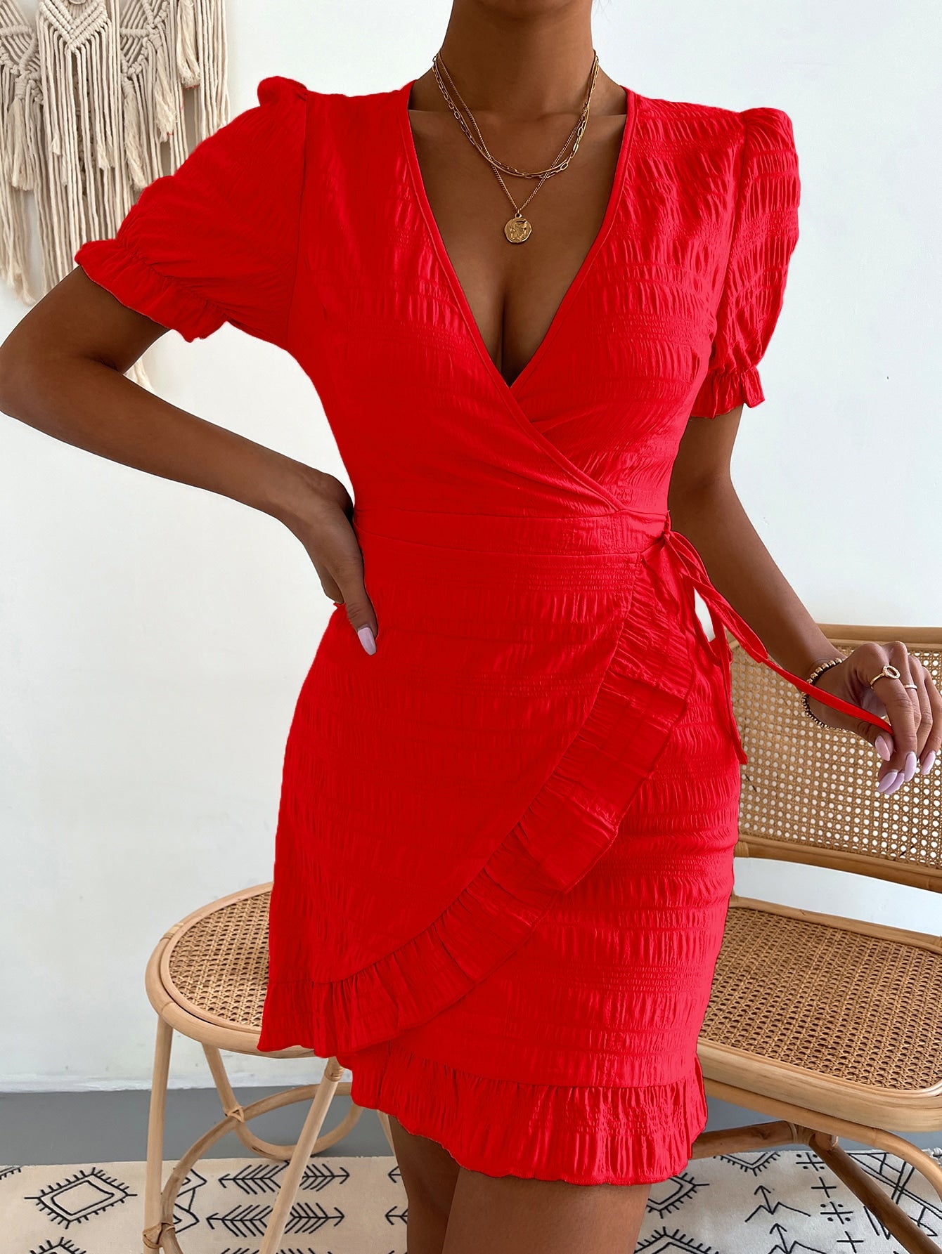 Wickelkleid mit Puffärmeln, Rüschenbesatz, seitlichem Band