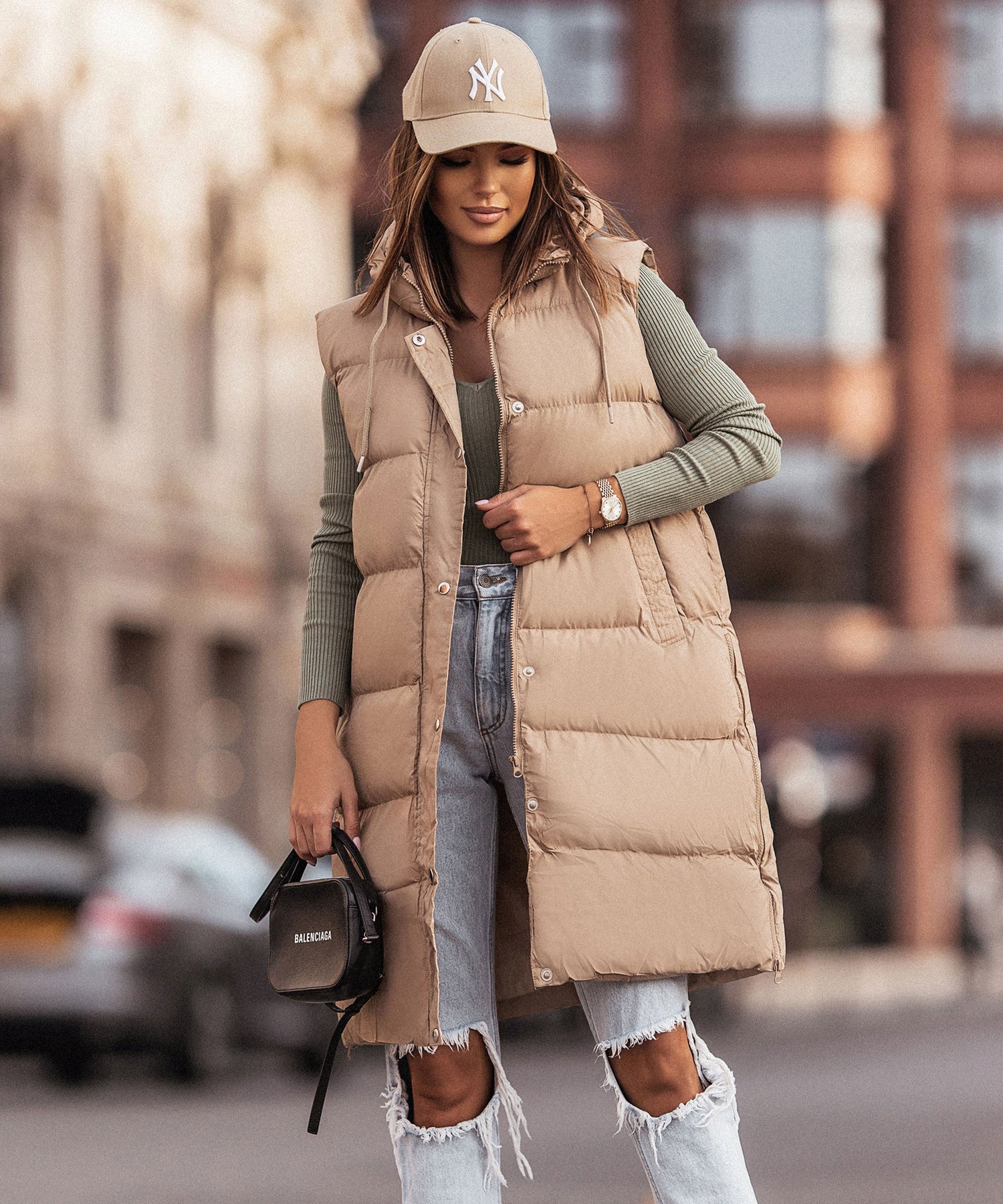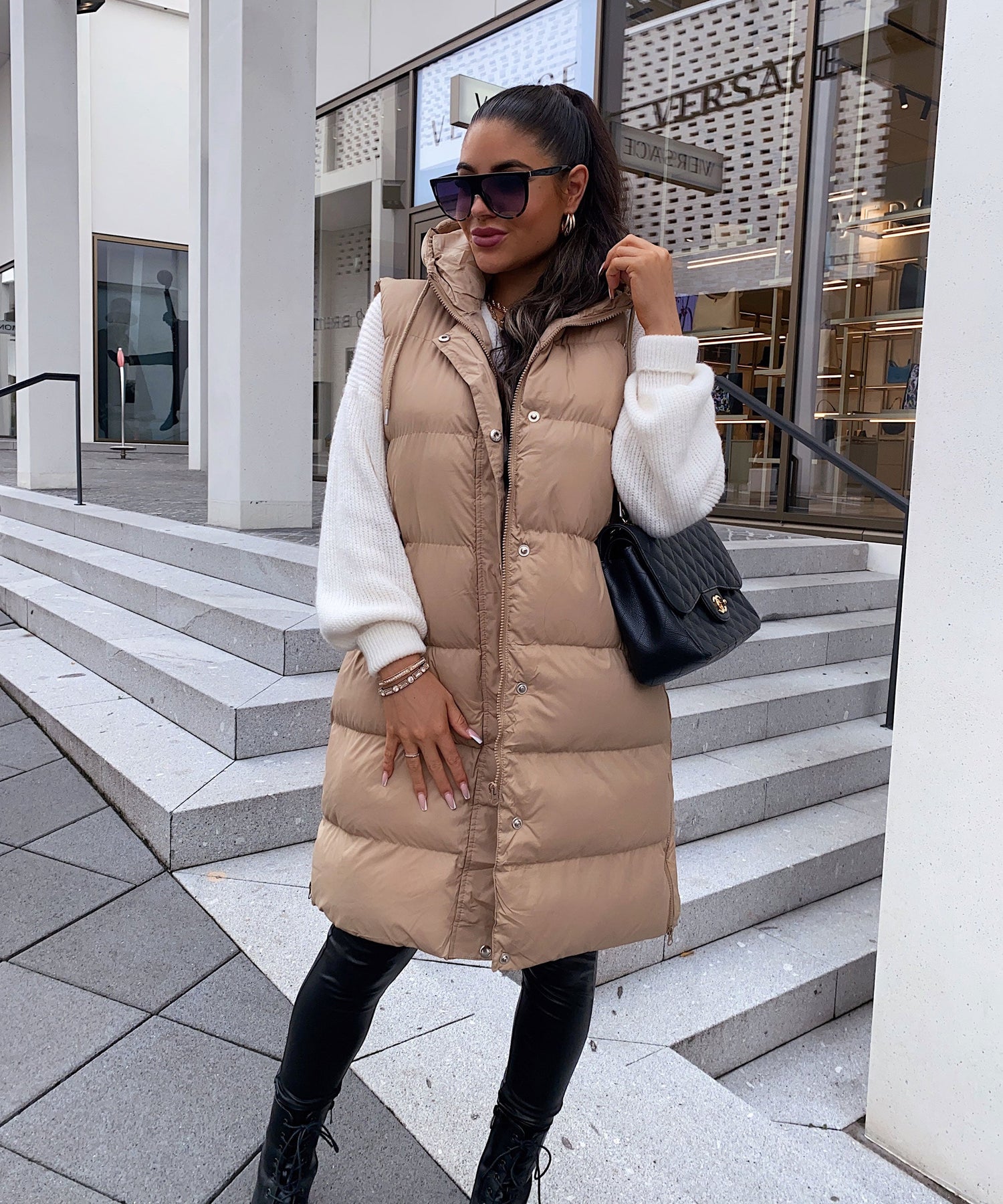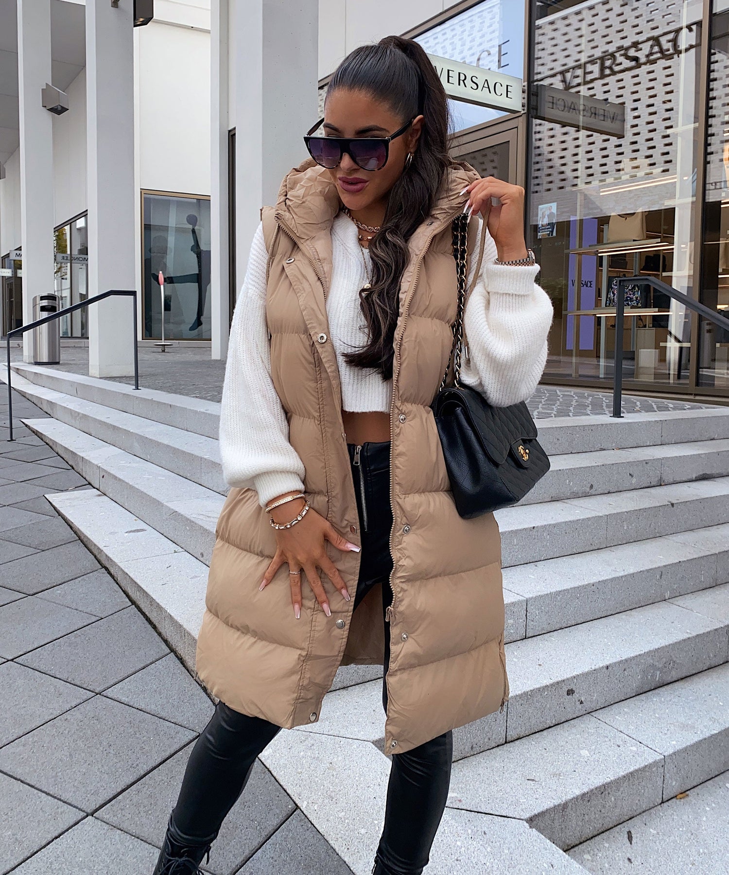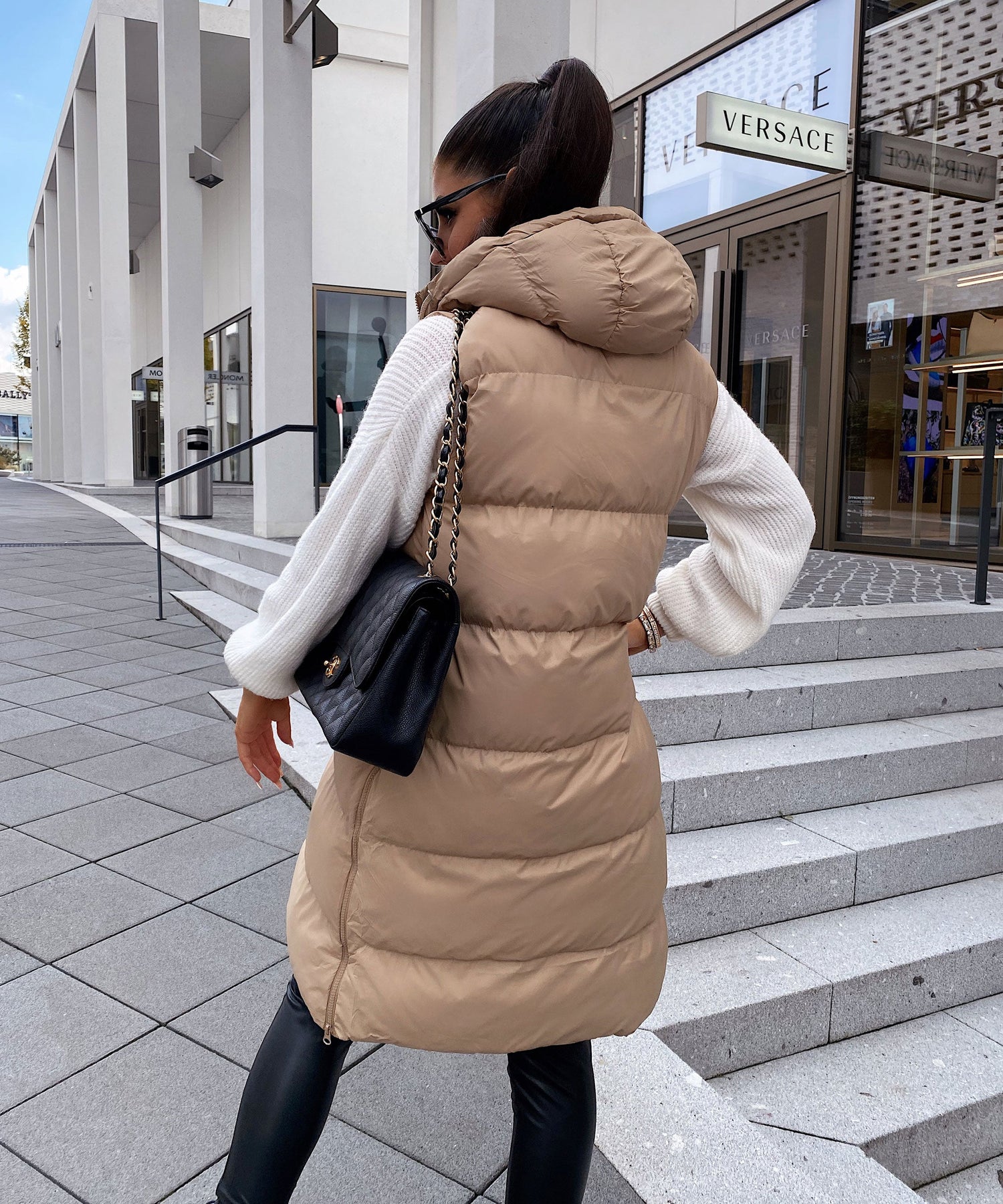 • Fällt normal aus. Wenn ihr euch unsicher seid, wählt eher die kleinere Größe aus, da die Weste schön locker geschnitten ist, sodass man dicke Pullover drunter tragen kann.  Model ist 1.65m groß und trägt Größe S (36). Mit Kapuze.