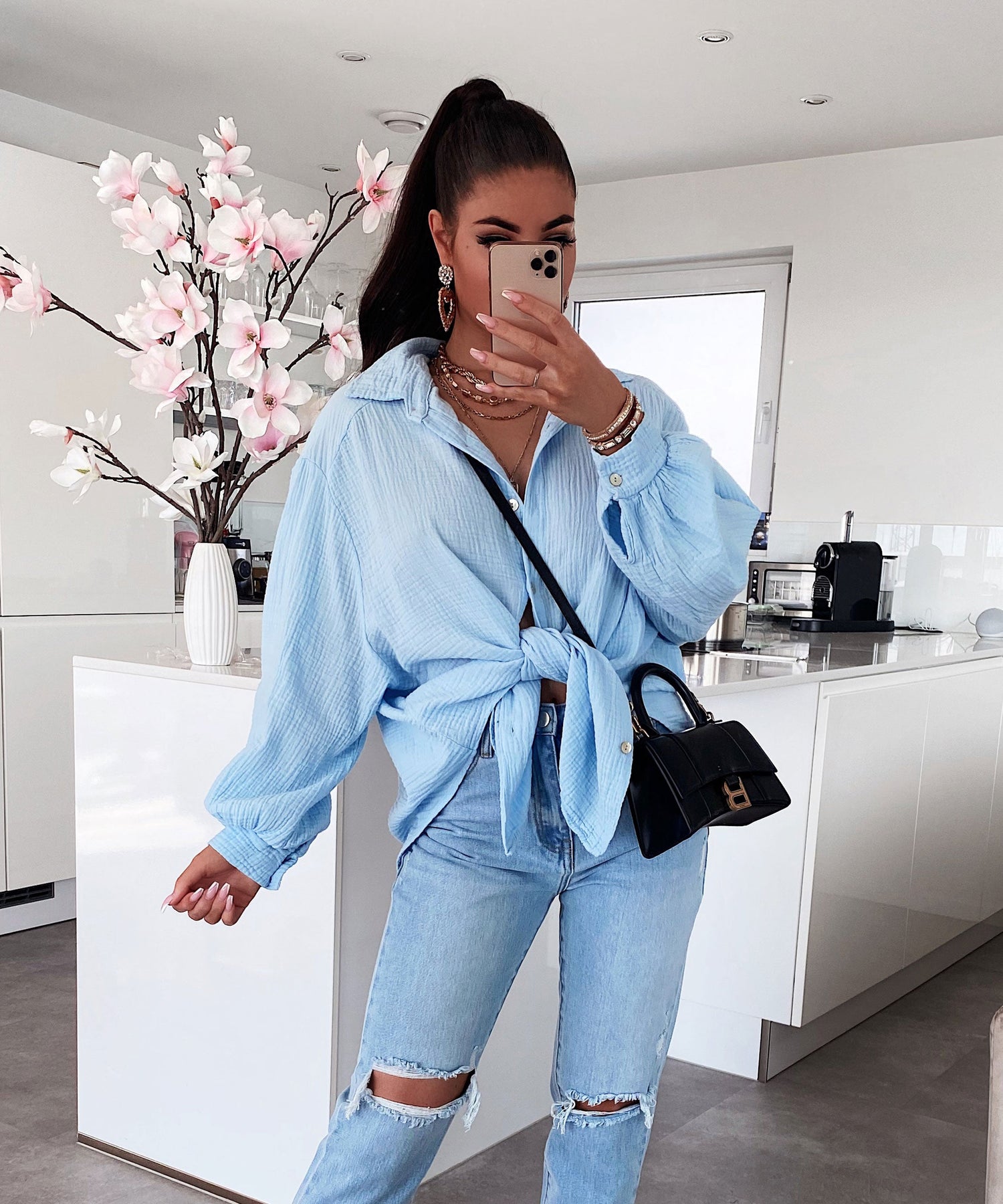 Oversize Musselin Bluse Freya Hellblau Kurz