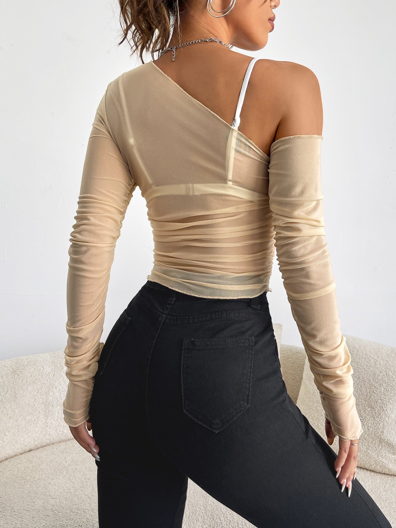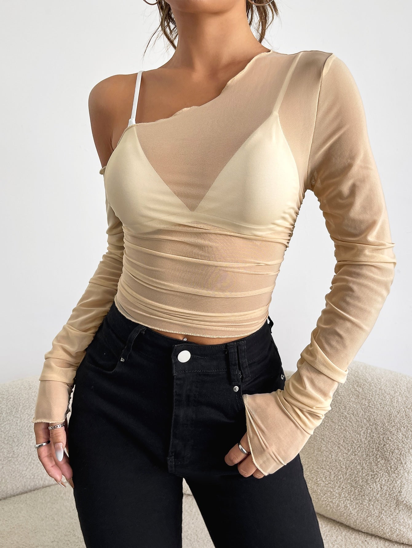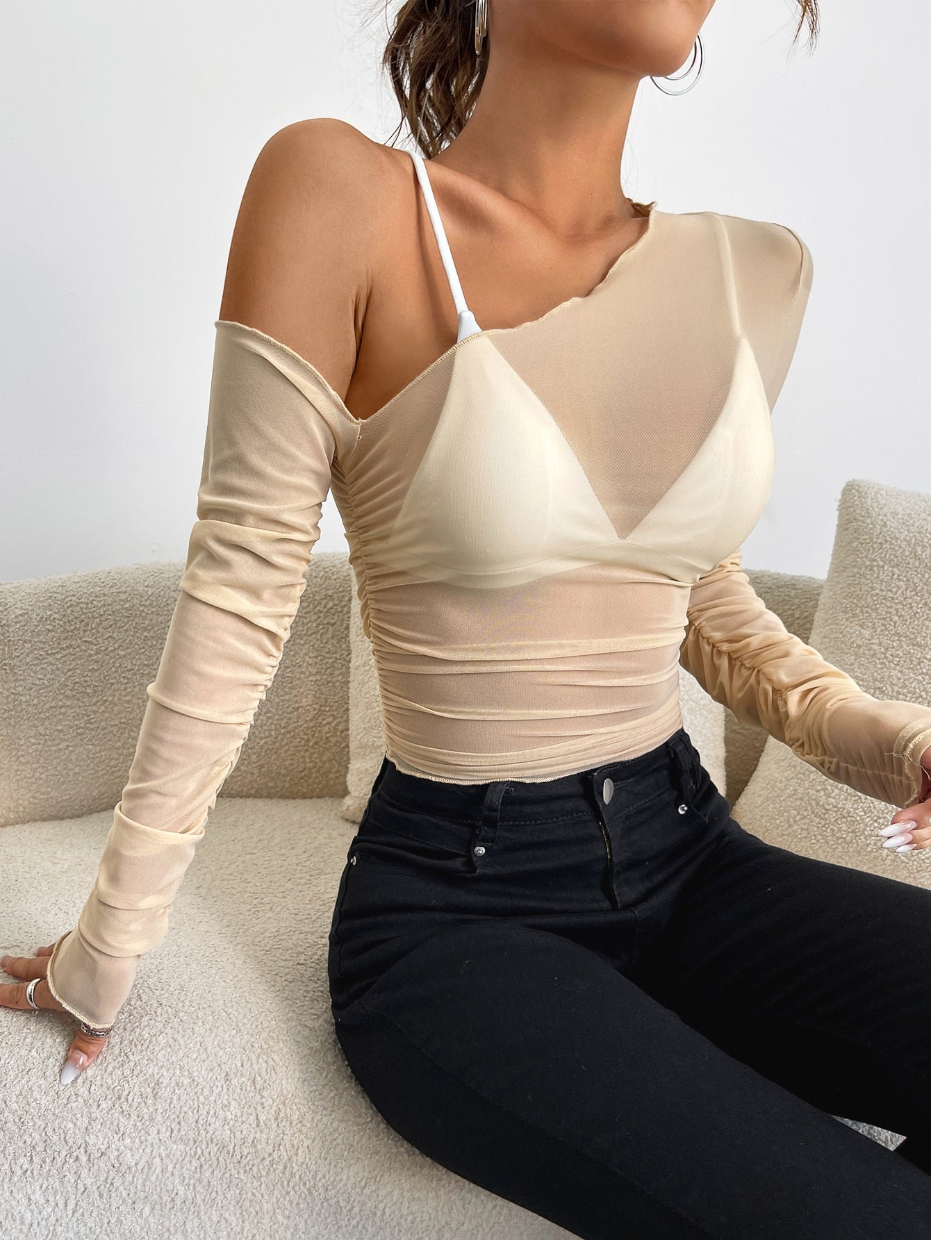 Top mit asymmetrischem Kragen, transparentem Netz, ohne BH