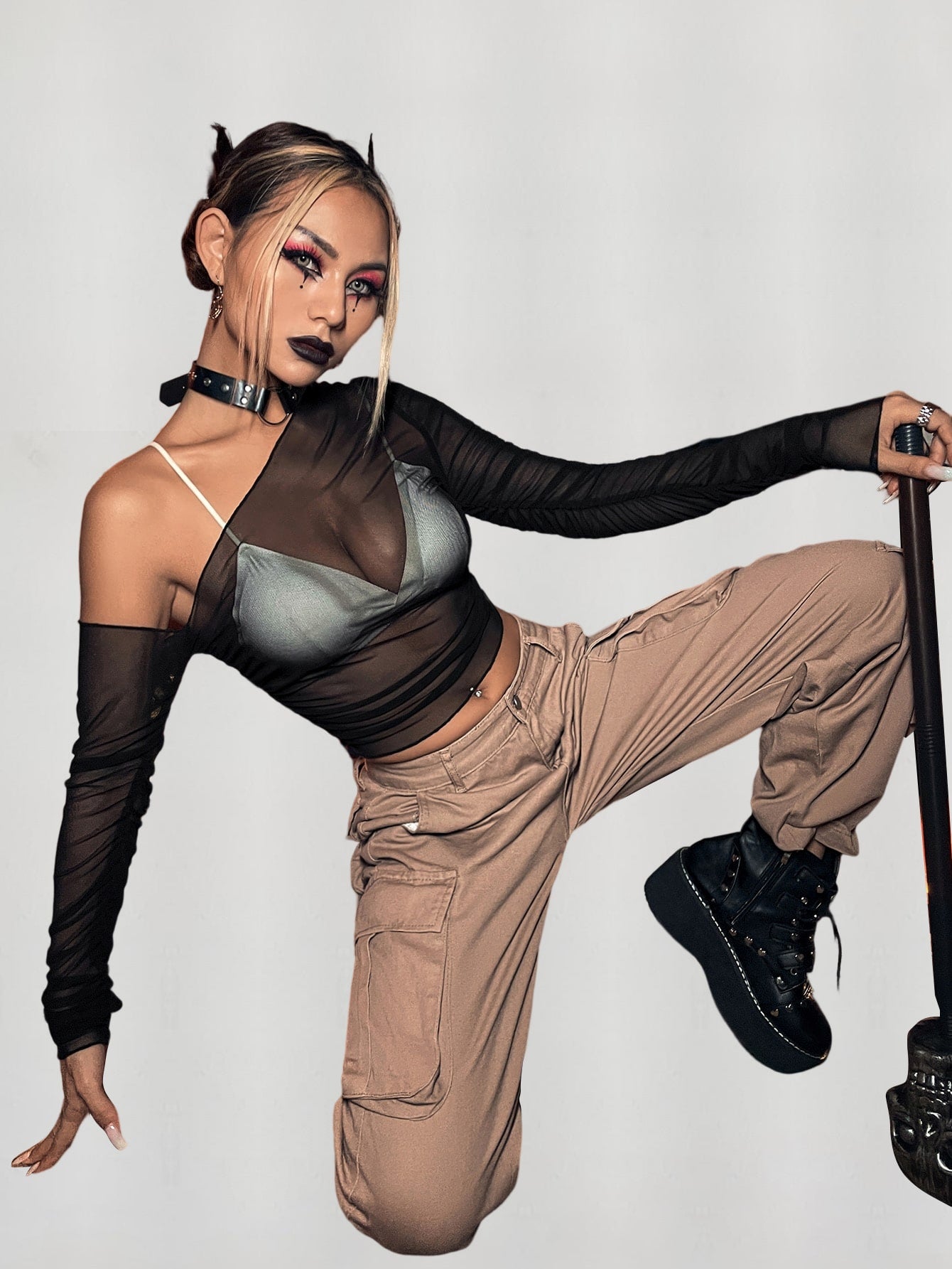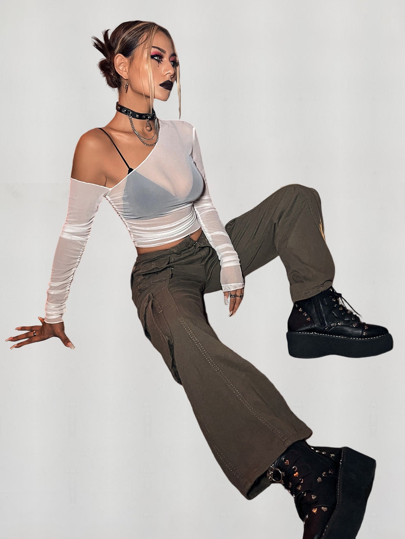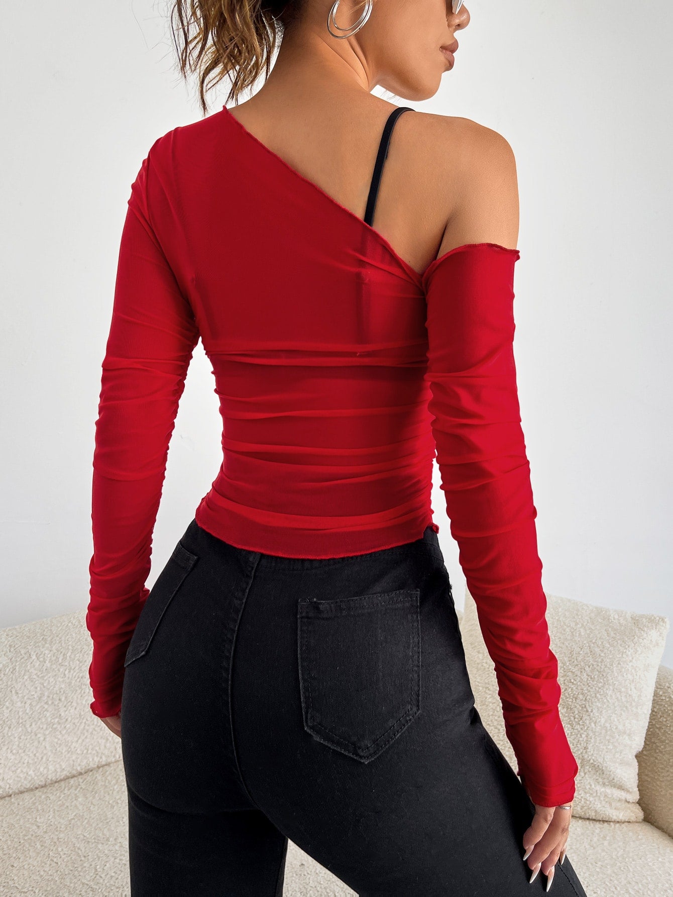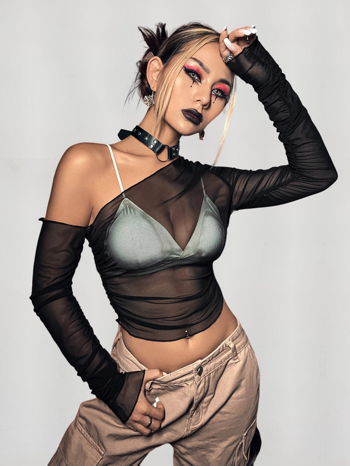 Top mit asymmetrischem Kragen, transparentem Netz, ohne BH