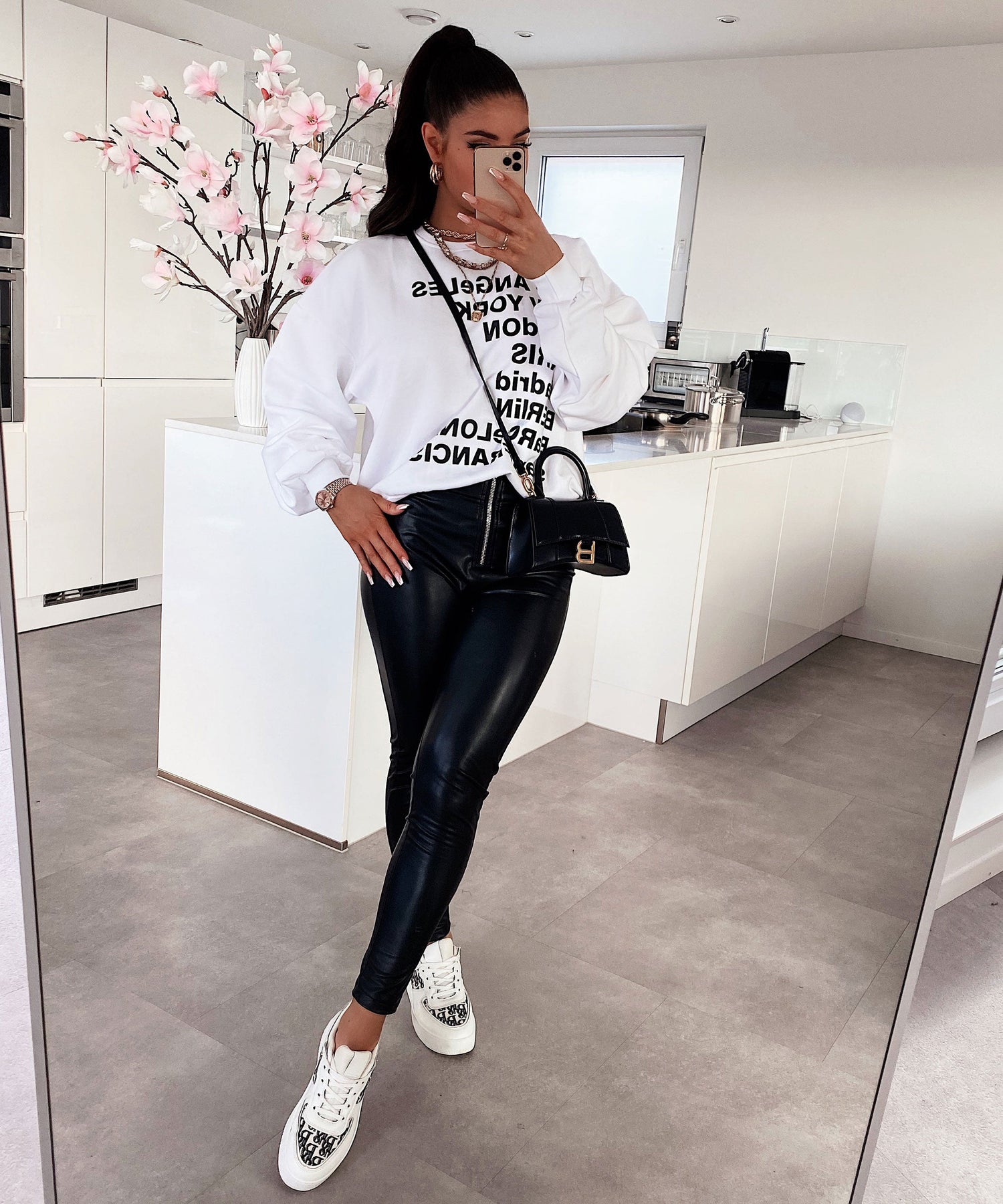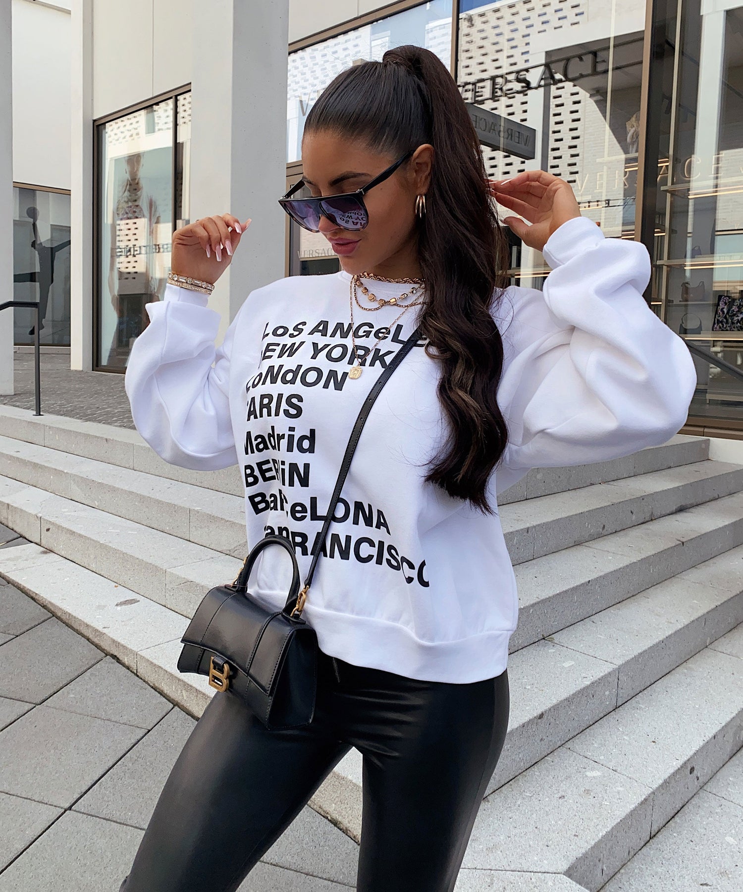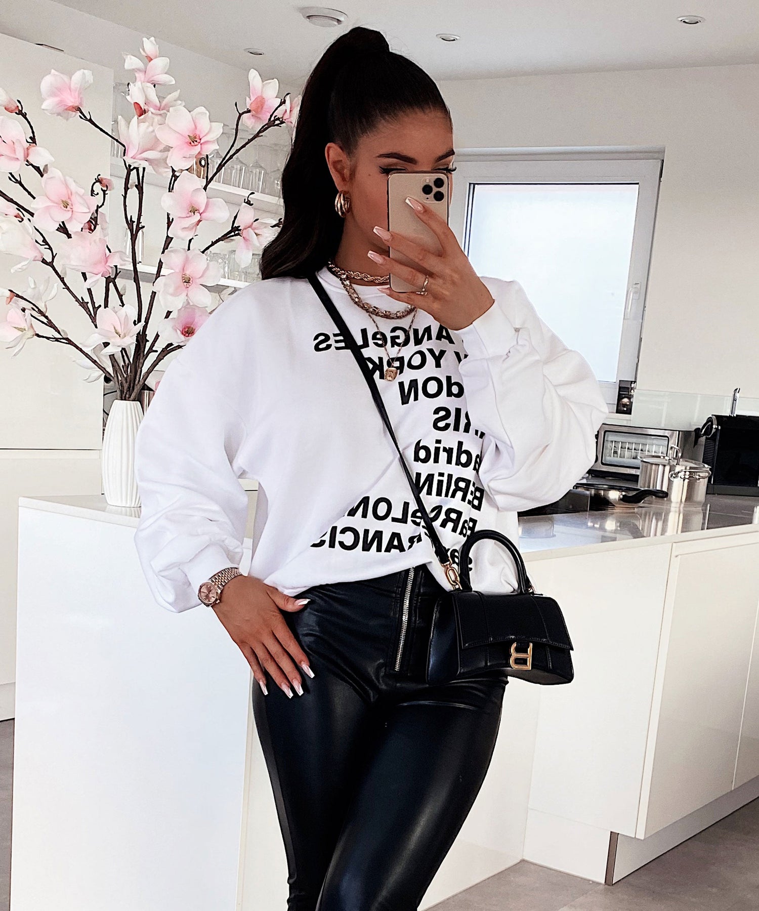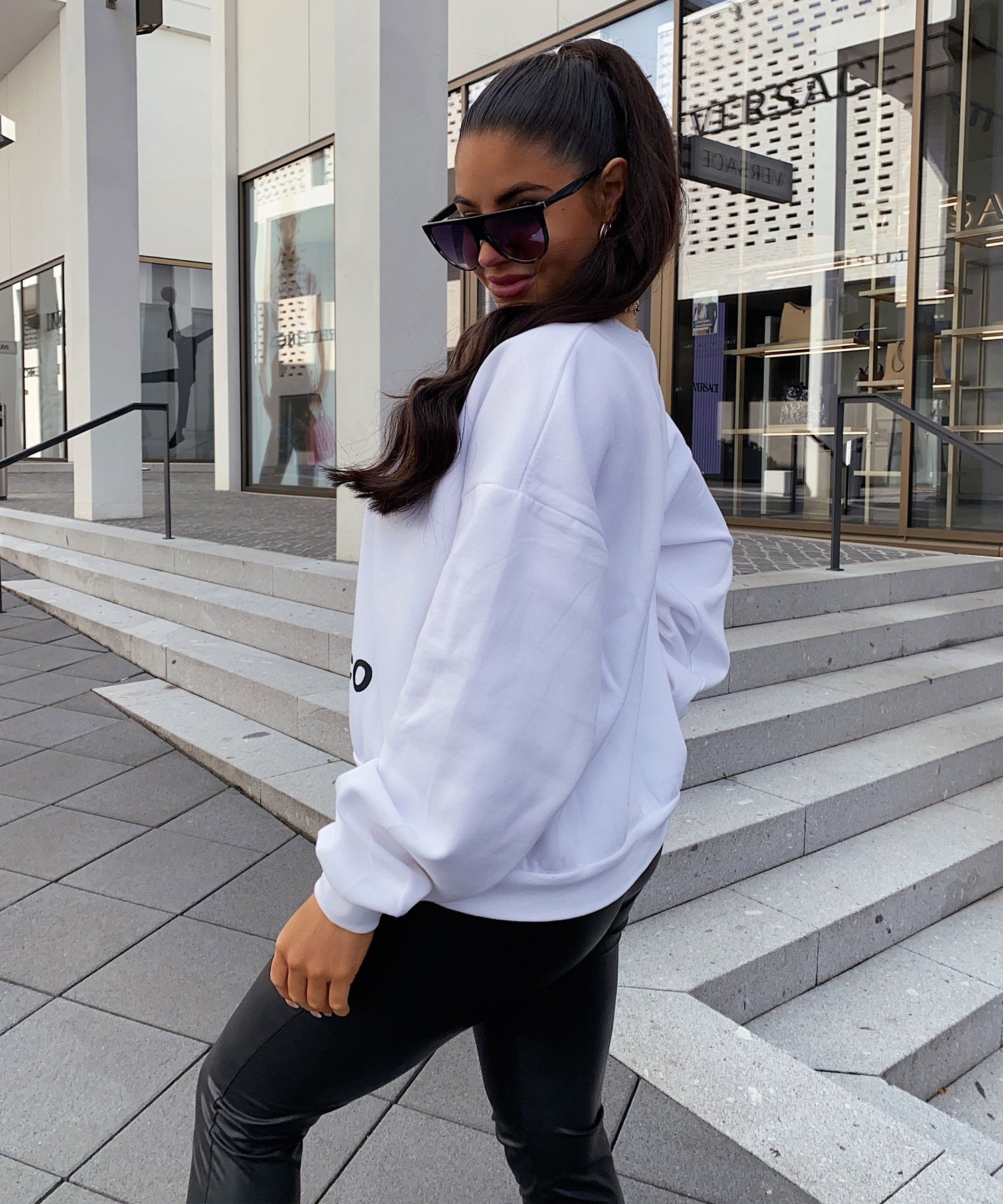 • Weicher, gefütterter oversize Pullover. Einheitsgröße passt XS-XL. Model eins ist 1.69m. Model zwei ist 1.65m.