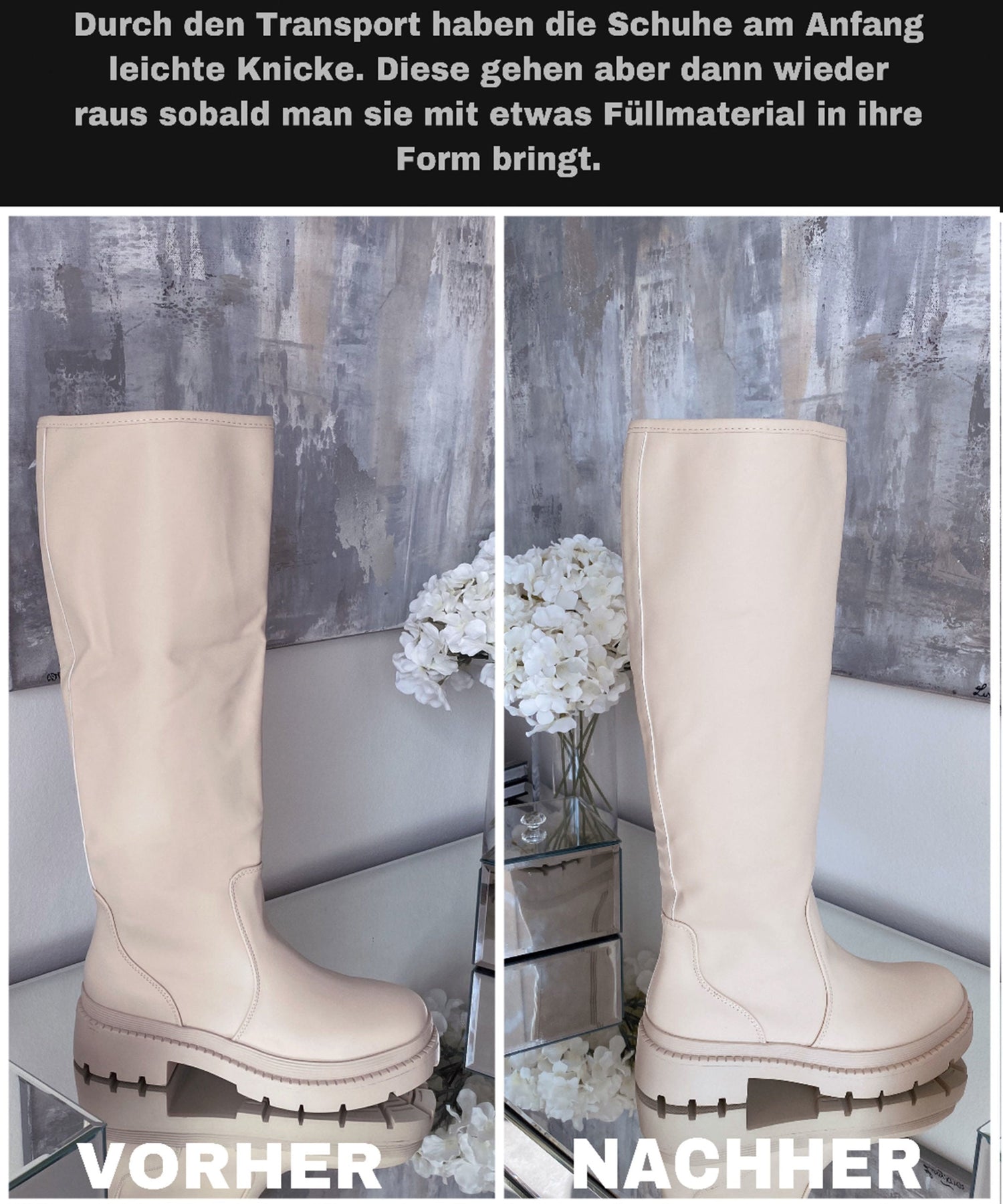Durch den Transport haben manche Schuhe am Anfang leichte Knicke diese gehen aber mit der Zeit raus. Tipp: Mit Füllmaterial ausstopfen, anföhnen und glatt streichen dann verschwinden die Knicke direkt.
