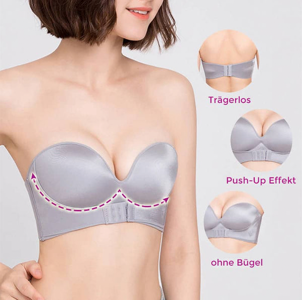 Der trägerlose BH hat die Fähigkeit, Ihren Brüsten Festigkeit und einen Push-up zu verleihen, da er einen zusätzlichen Verschluss auf der Vorderseite bietet.